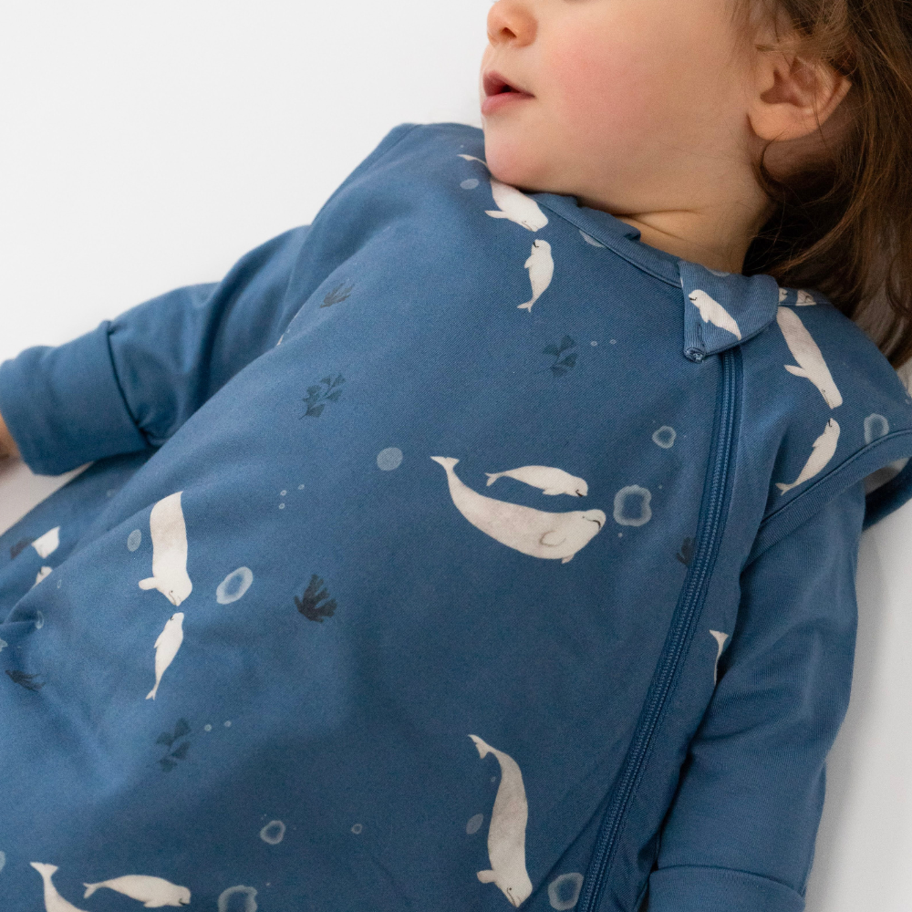 Fabric is digitally printed with our custom Belugas print on a dark blue background. This playful aquatic print features mama and calf Beluga whales together with underwater foliage and bubbles.