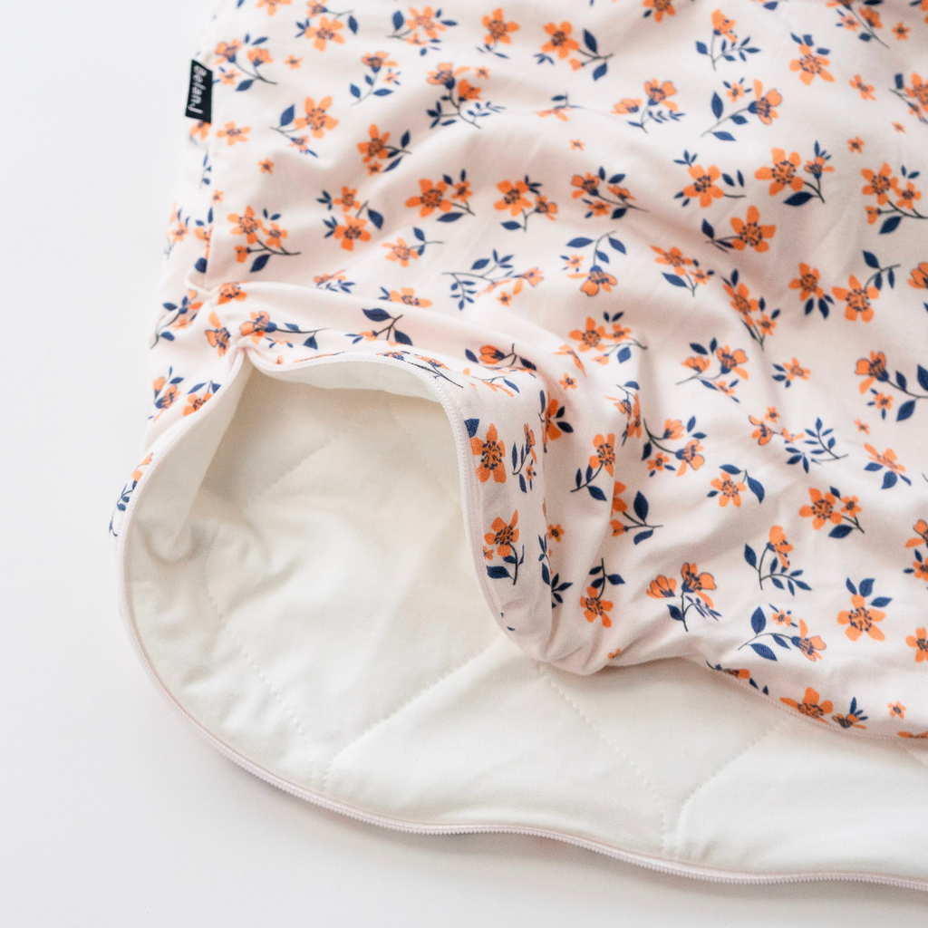 Fabric has been digitally printed with our custom Peachy Blossom print - a delicate peach floral with blue leaves set on a soft peachy/pink background.