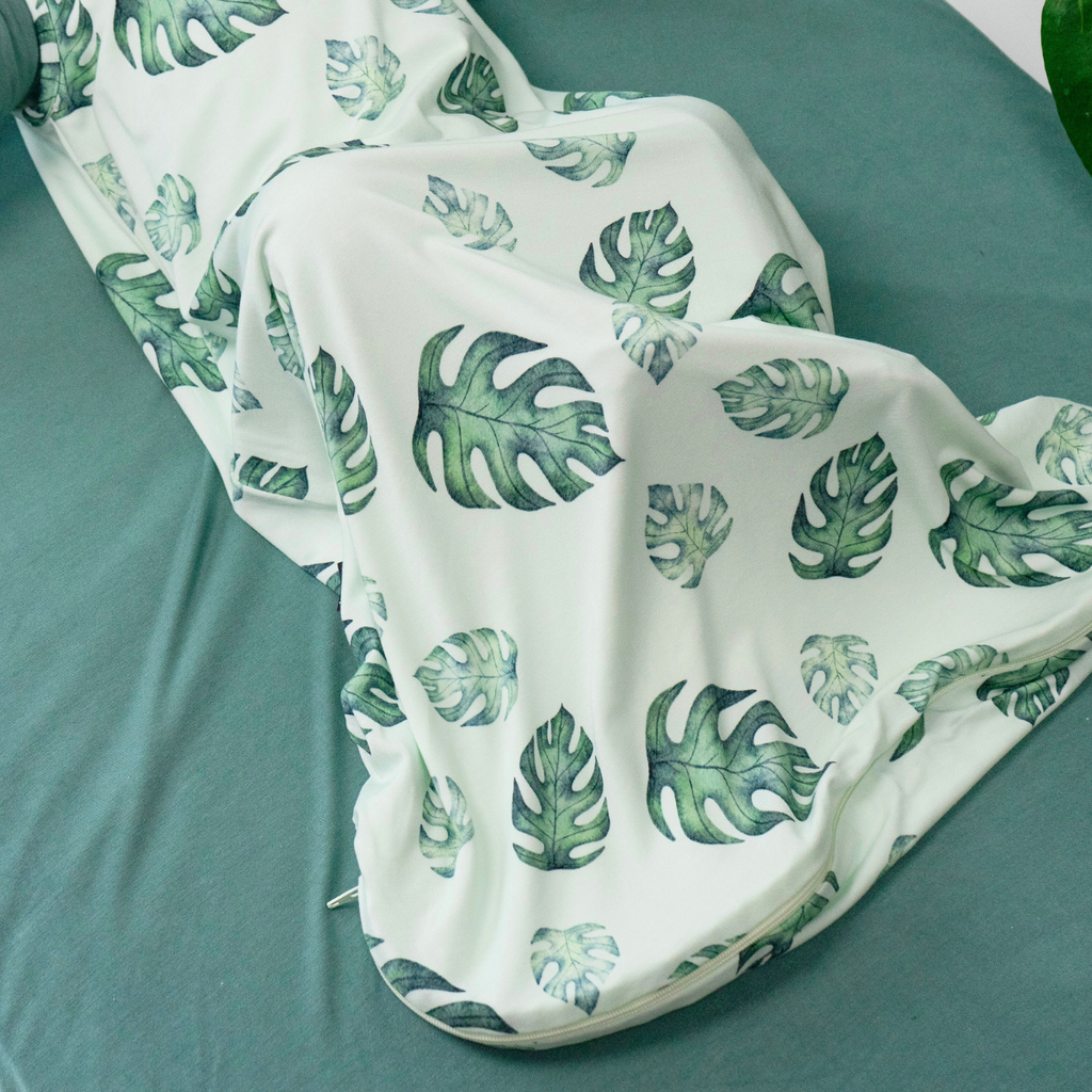 Digitally printed with our custom Tropical Leaves print featuring beautiful watercolour style monstera leaves printed on a light sea green background. Coordinates beautifully with Leafy Green solid