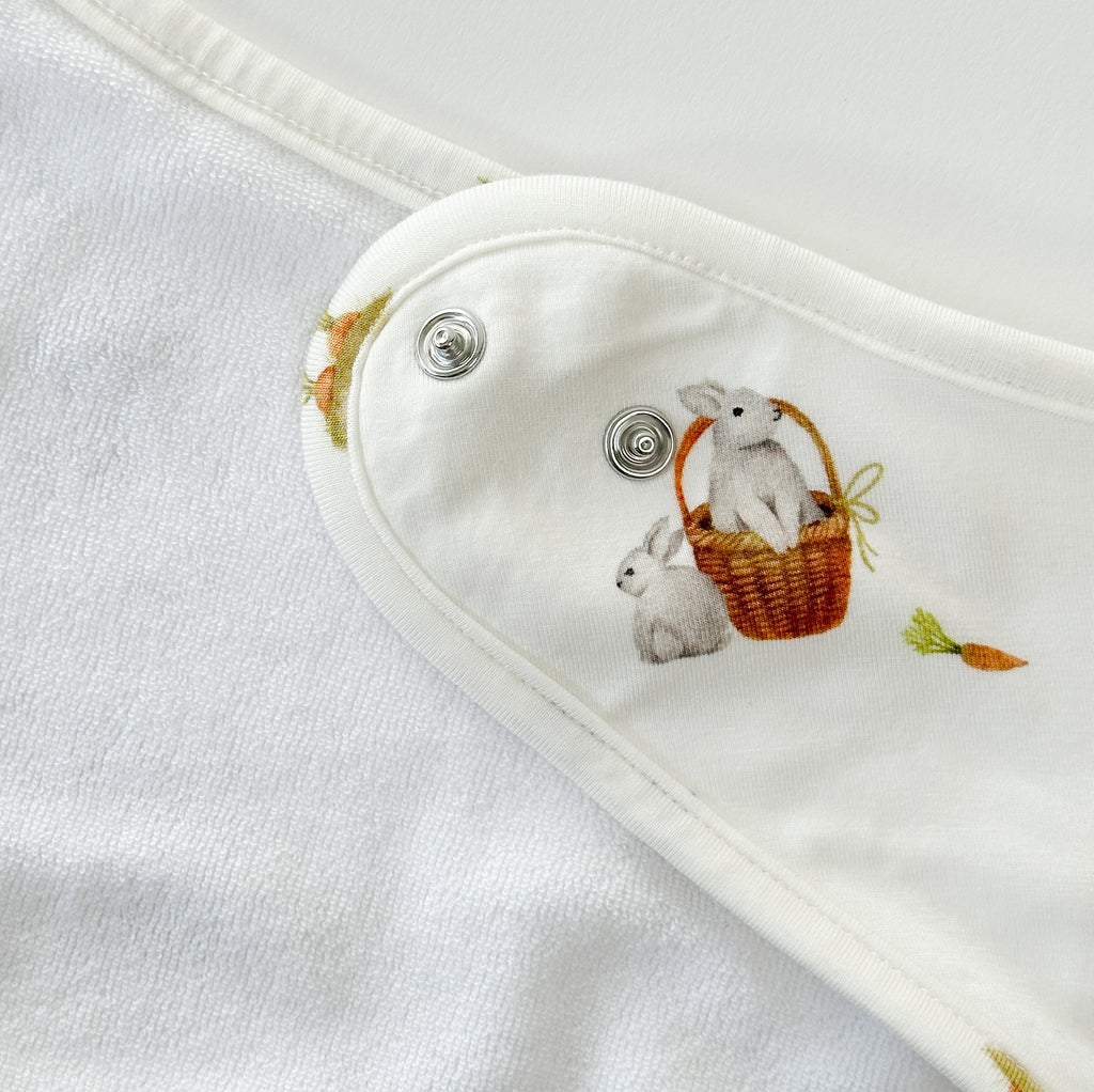 Fabric has been digitally printed with our custom Garden Bunnies print. This Easter themed print features hopping bunnies and bunnies in baskets along with carrots ready to be picked.