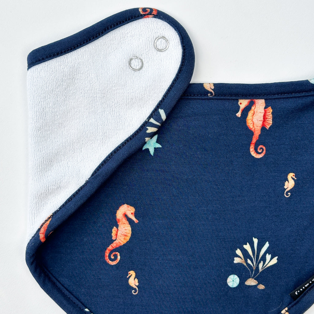 Fabric is digitally printed with our custom Seas the Night print which features seahorses with starfish, sand dollars and other tide pool finds. Background colour on this version of this print is a deep blue.
