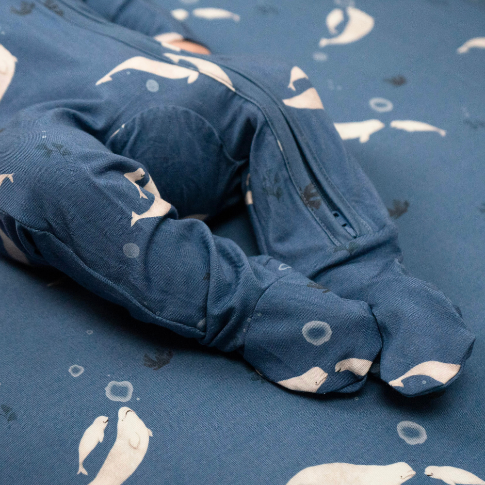 Fabric is digitally printed with our custom Belugas print on a dark blue background. This playful aquatic print features mama and calf Beluga whales together with underwater foliage and bubbles.