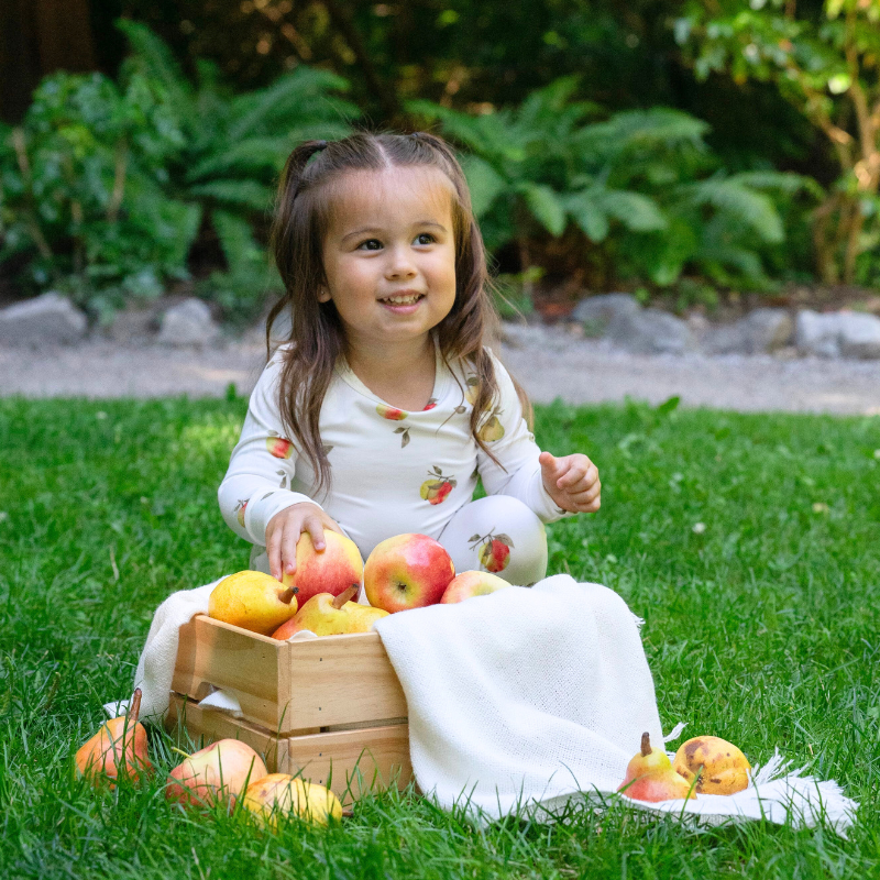 Our custom ORCHARD print celebrates the fall harvest! This print features apples and pears with a small scattering of leaves, digitally printed on a white background.