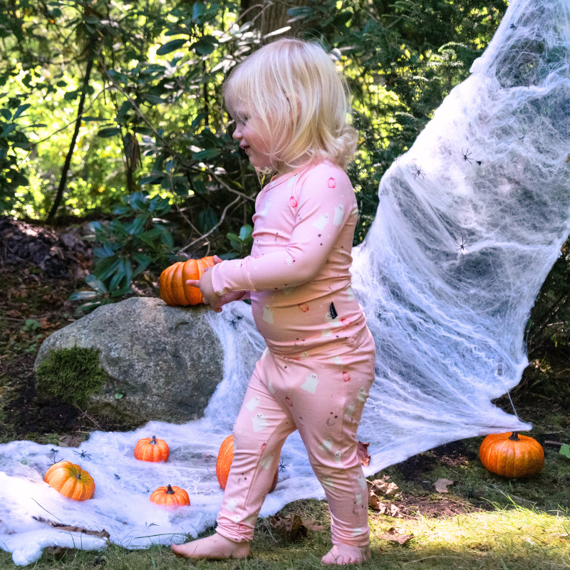 BOO! Our PINK GHOST print features friendly ghosts and pumpkins with a scattering of moons and stars on a pink background.