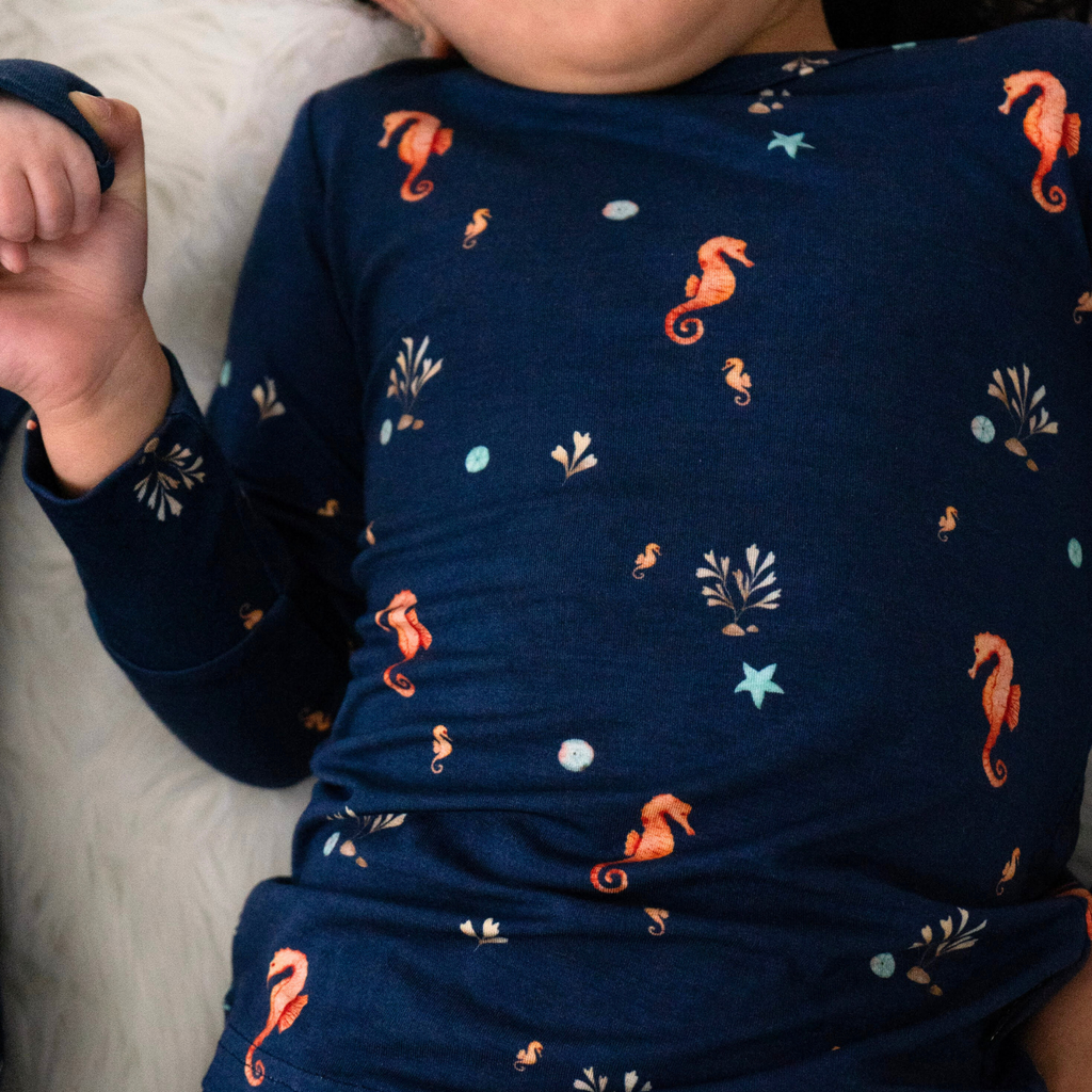 Fabric is digitally printed with our custom Seas the Night print which features seahorses with starfish, sand dollars and other tide pool finds. Background colour on this version of this print is a deep blue.