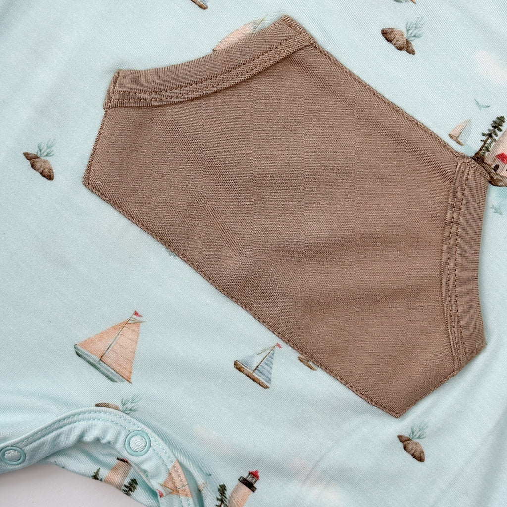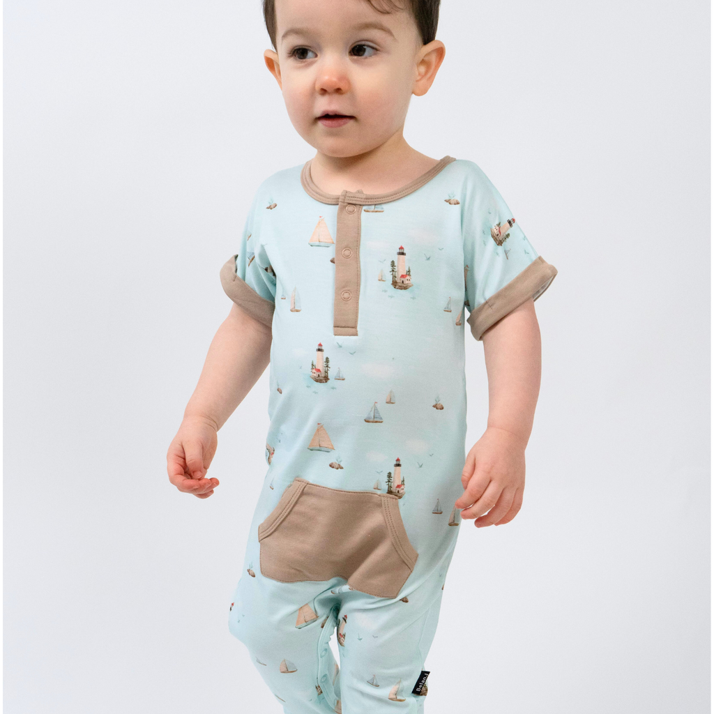 Short Sleeve Pocket Romper - Lighthouse / Sandstone