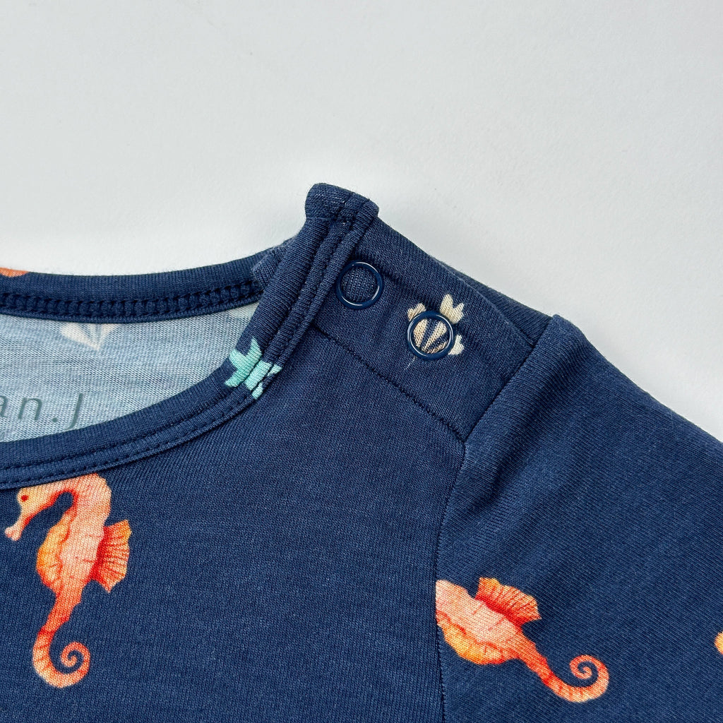 Fabric is digitally printed with our custom Seas the Night print which features seahorses with starfish, sand dollars and other tide pool finds. Background colour on this version of this print is a deep blue.