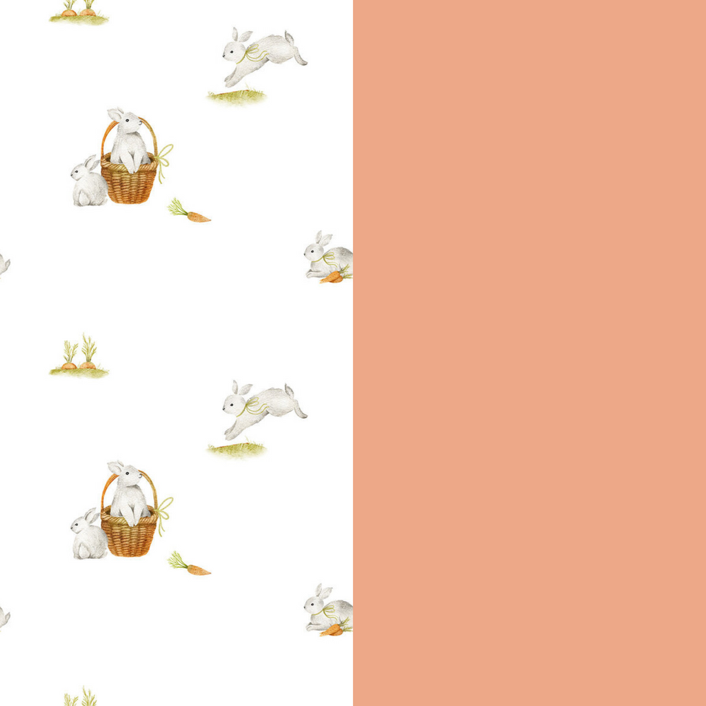 Fabric has been digitally printed with our custom Garden Bunnies print. This Easter themed print features hopping bunnies and bunnies in baskets along with carrots ready to be picked. Quilted side is Carrot solid.