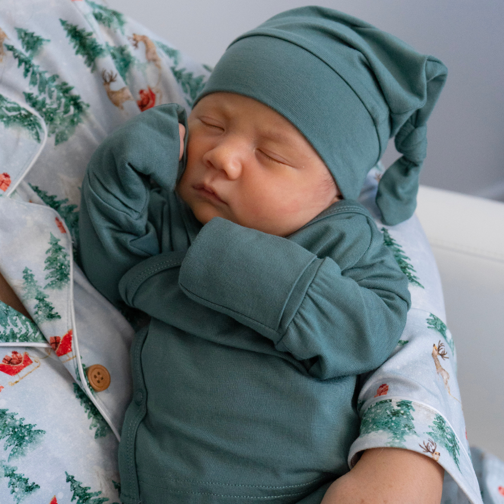 The perfect newborn outfit! This kimono set makes life easy - with two pieces designed for comfort and easy dressing. Kimono top opens fully with reinforced side snaps, so no pulling over baby's head. The high waisted bottom are footed so no need for socks! Both pieces are made from soft bamboo rayon, great for delicate newborn skin. Pair with a matching knotted hat for a perfect "home from the hospital" outfit.