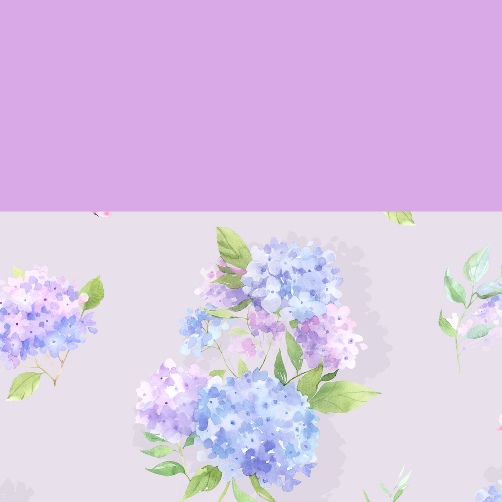 Fabric is digitally printed with our Hydrangeas print which features beautiful violet and blue hydrangeas in our classic watercolour style on a soft grey background. Reverse side in in Violet solid.