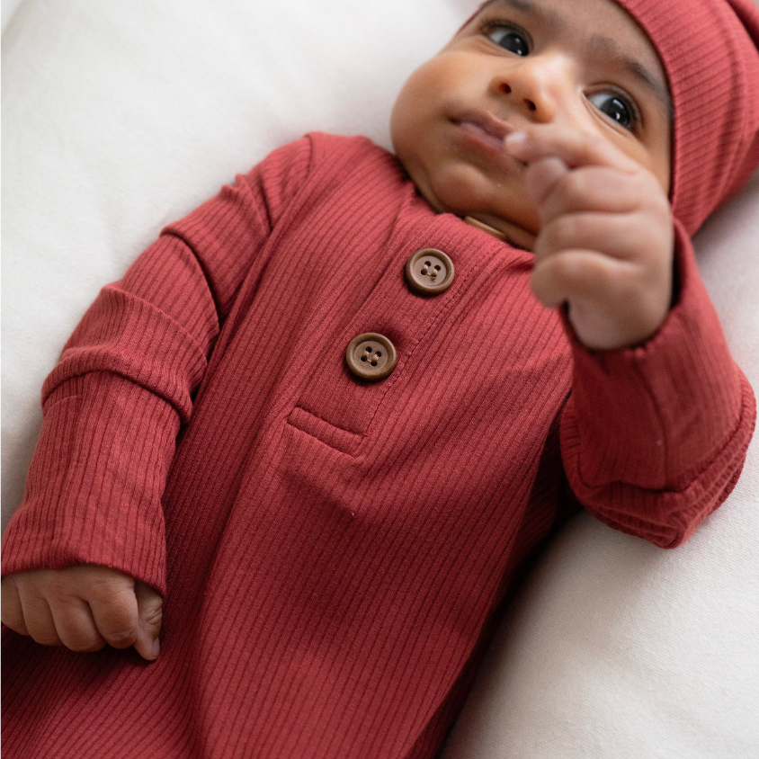 Made with soft premium bamboo rayon fabric - perfect for newborn's sensitive skin. The neckline features an snap opening allowing for easier dressing and an adjustable tie at the bottom is perfect for newborn babies and easy diaper changes. The sleeves feature a fold over cuff to protect your baby from scratches. Pair with a matching knotted hat for adorable newborn pictures.