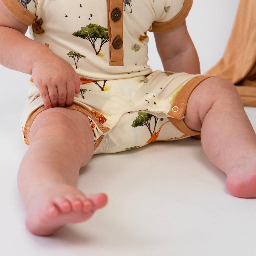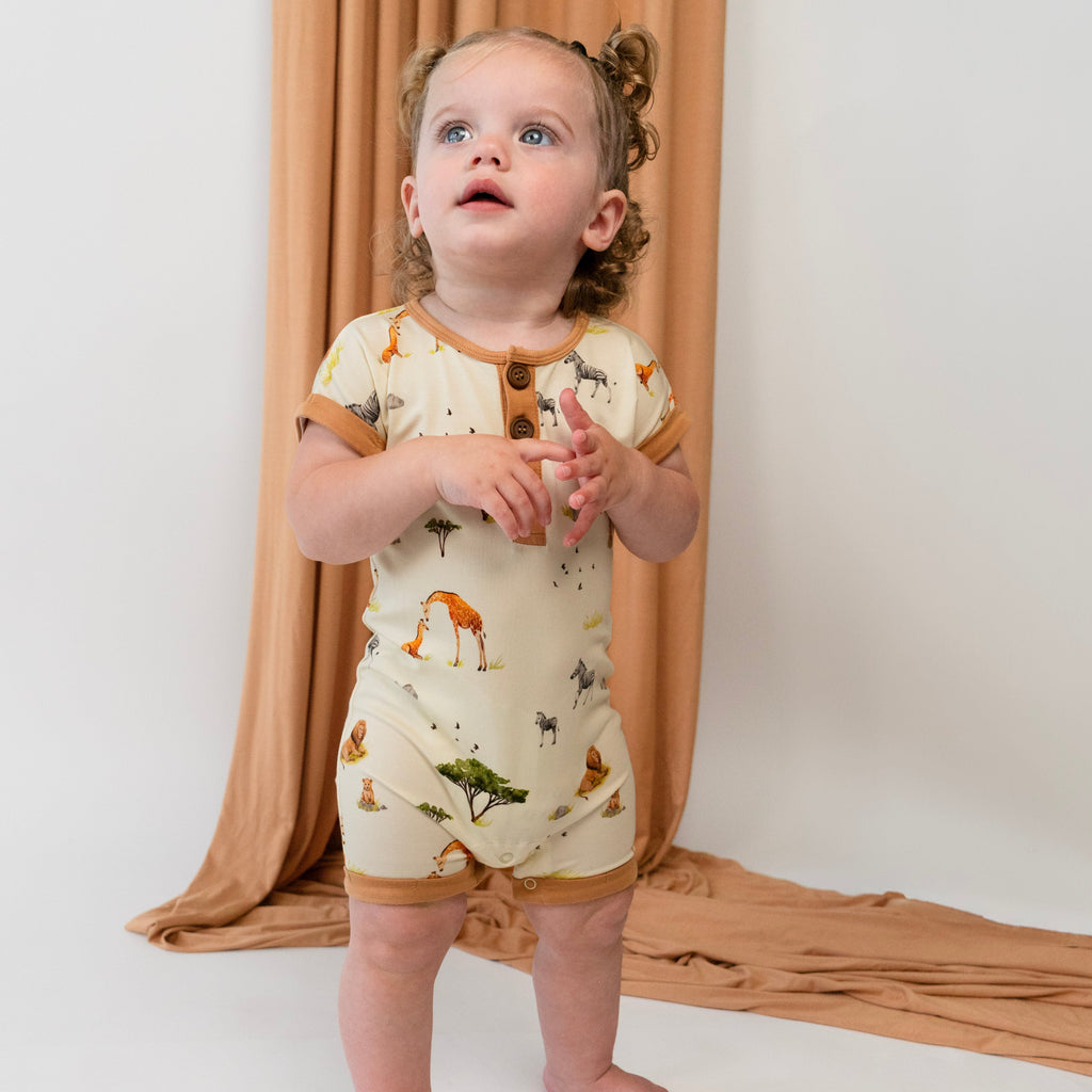 Get summer ready with this short sleeve romper! This easy one piece daywear style features a button down neckline and snaps at bottom for easy diaper changes. Made with buttery soft Bamboo Rayon, this will be one style both you and your little one want to wear over and over.
