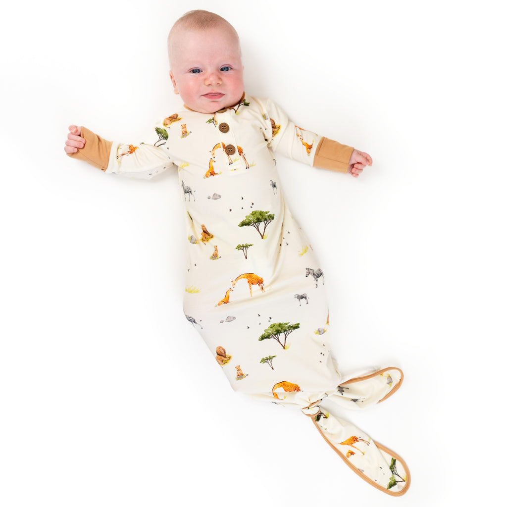 Made with buttery soft Bamboo Rayon fabric - perfect for newborn's sensitive skin. The neckline features an snap opening allowing for easier dressing and an adjustable tie at the bottom is perfect for newborn babies and easy diaper changes. The sleeves feature a fold over cuff to protect your baby from scratches. Pair with a matching knotted hat for adorable newborn pictures.