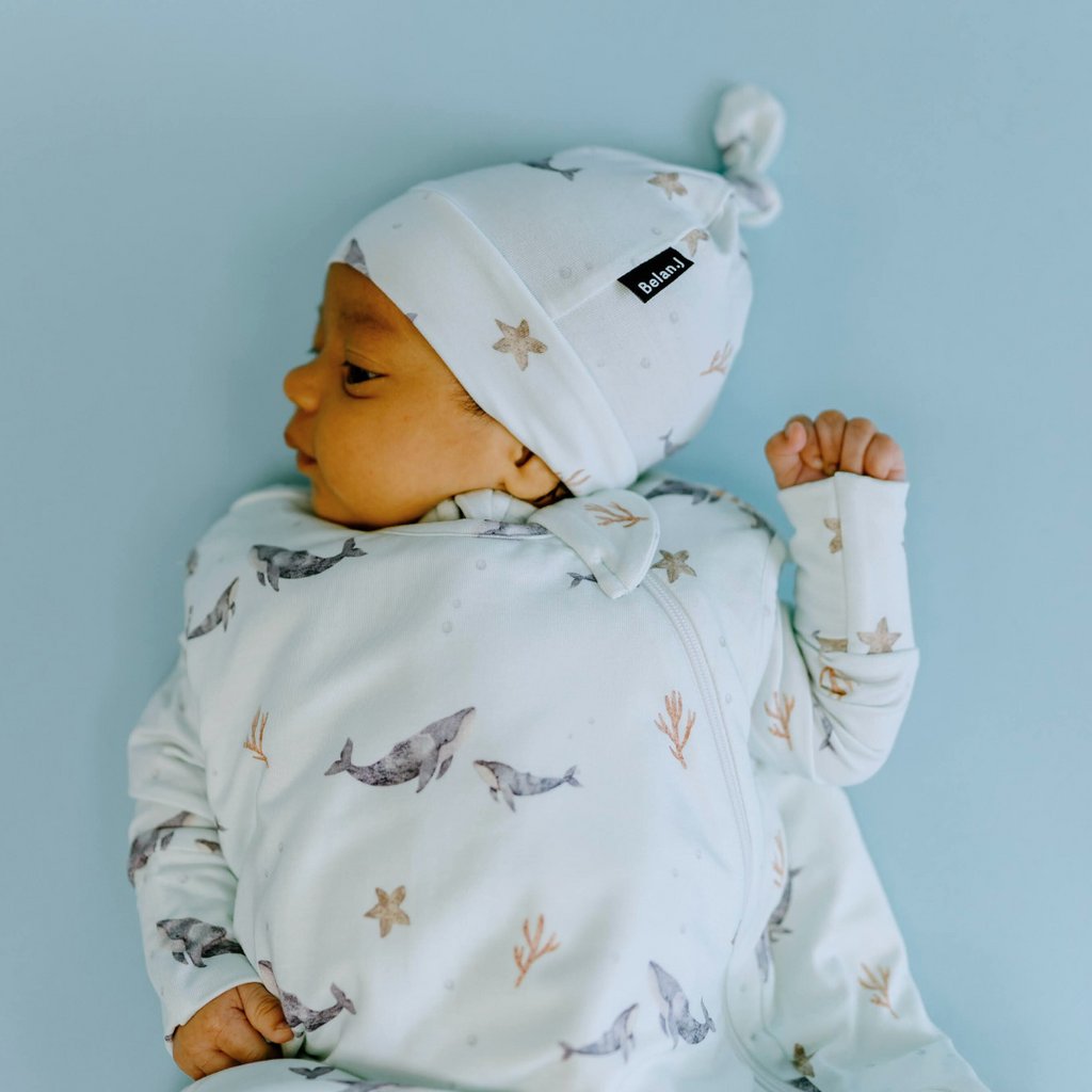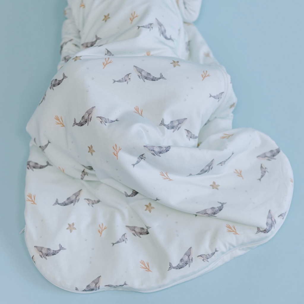 Digitally printed with our custom Blue Whales print featuring mama and baby whale, coral and starfish on a light blue background.