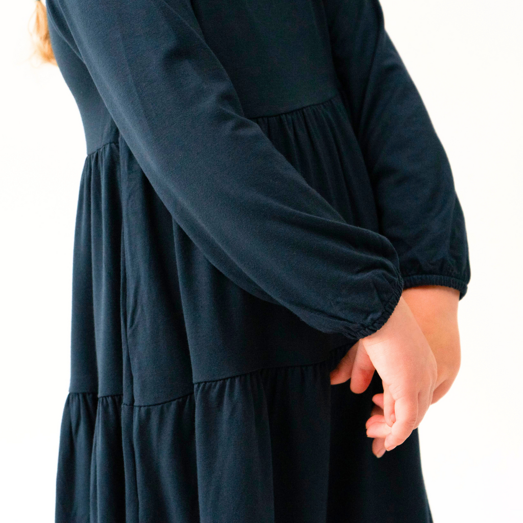 Longsleeve dress with 2 gathered tiers - perfect for twirling! Crafted with our premium bamboo rayon, this dress mixes style and comfort for a cozy daywear style. Sleeves feature elastics at cuffs for a slight gathered look.