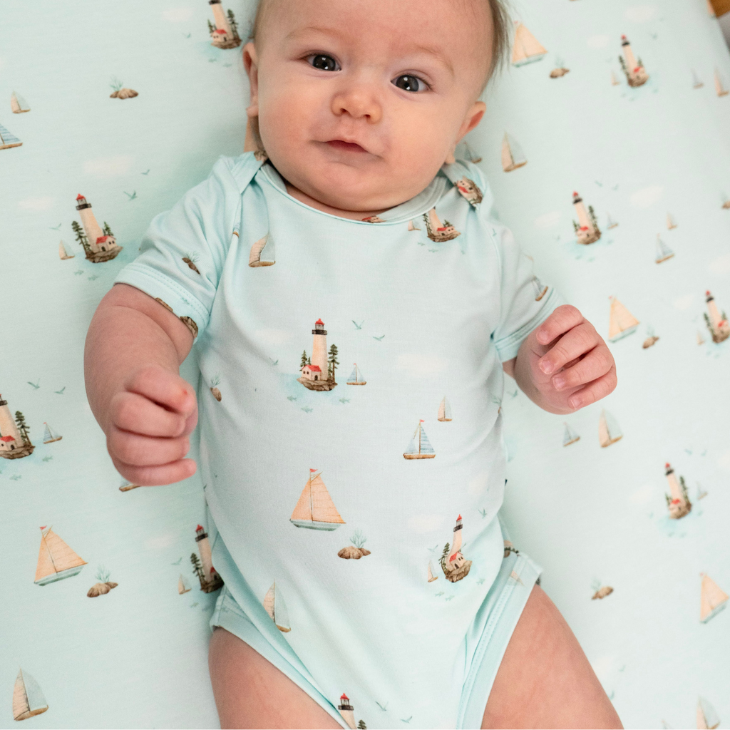 Classic short sleeve onesie with snap bottom for easy diaper changes. The envelope neckline makes dressing little ones quick and easy. Crafted with our premium bamboo rayon, this onesie is the perfect base layer for Spring & Summer.