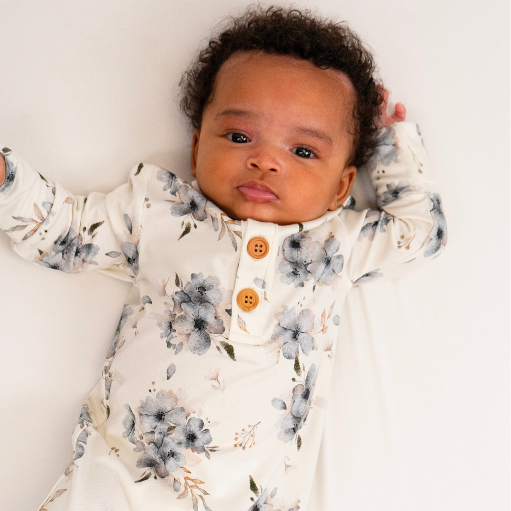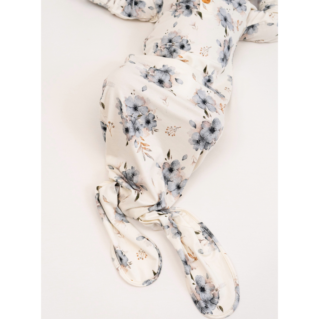 Made with soft premium bamboo rayon fabric - perfect for newborn's sensitive skin. The neckline features an snap opening allowing for easier dressing and an adjustable tie at the bottom is perfect for newborn babies and easy diaper changes. The sleeves feature a fold over cuff to protect your baby from scratches. Pair with a matching knotted hat for adorable newborn pictures.