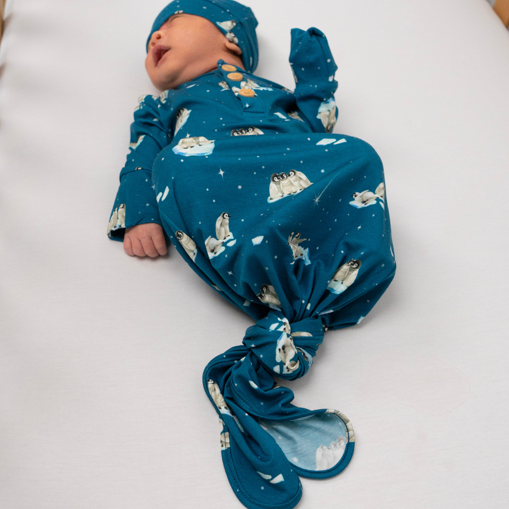 Made with soft premium bamboo rayon fabric - perfect for newborn's sensitive skin. The neckline features an snap opening allowing for easier dressing and an adjustable tie at the bottom is perfect for newborn babies and easy diaper changes. The sleeves feature a fold over cuff to protect your baby from scratches. Pair with a matching knotted hat for adorable newborn pictures.