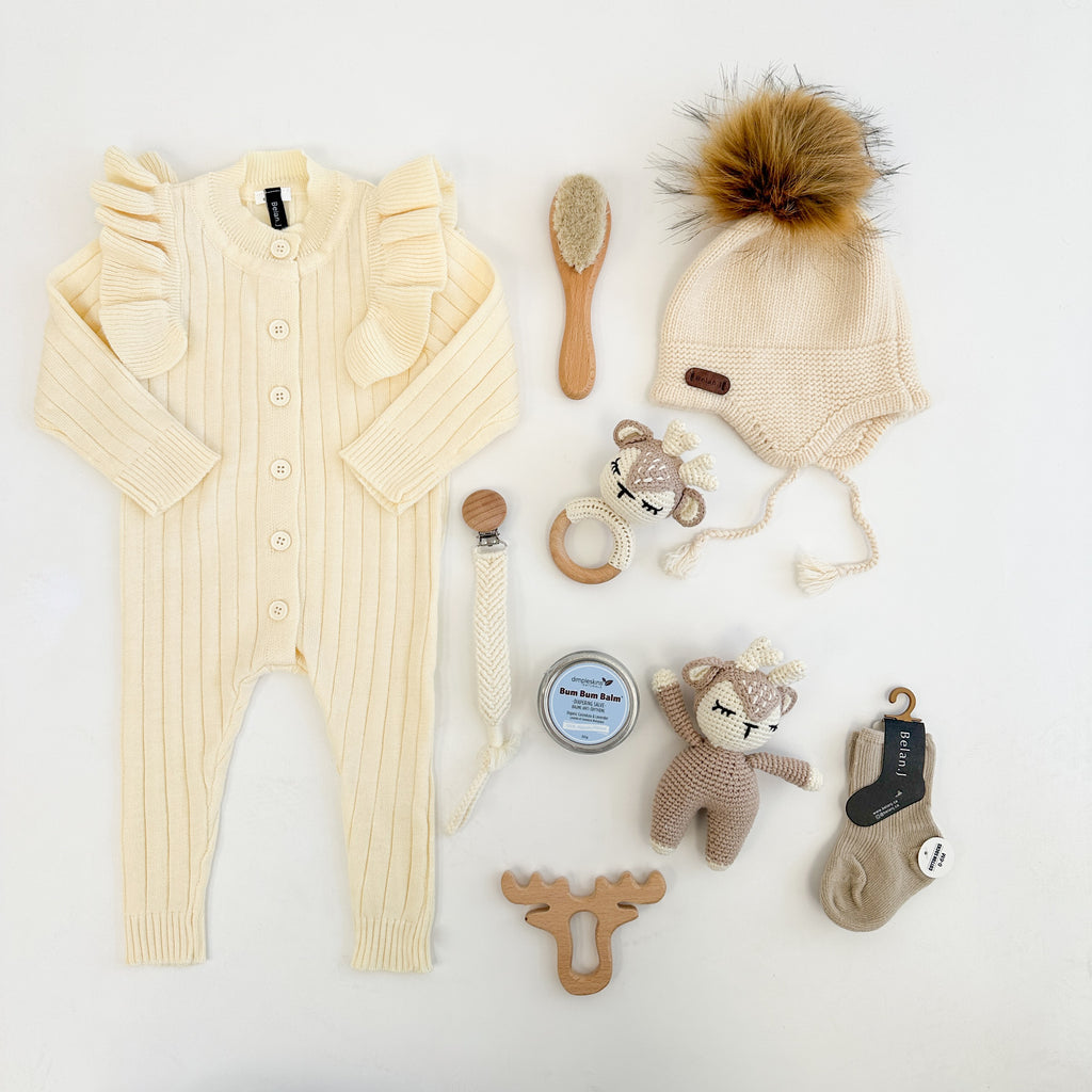 Welcome your little one into the world with the Belan.J Gift Set, a thoughtfully curated collection of baby essentials designed for comfort, care, and style. This cozy gift box is perfect for fall/winter babies with a soft wool/bamboo blend romper and beanie.
