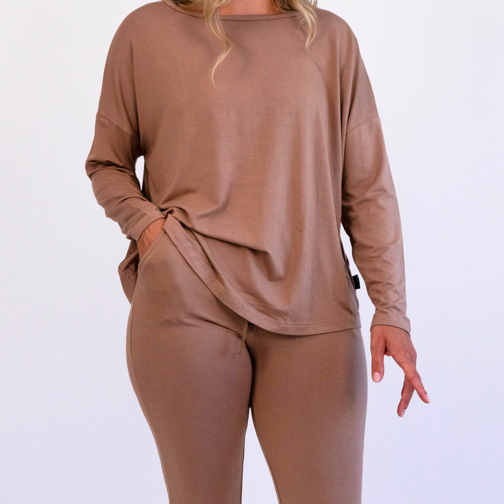Made from super soft ribbed Bamboo Rayon, this set was made for cozy cuddles. The top features a comfortable loose fit in a boxy style through the torso with drop shoulder fitted sleeves and a mid-hip length. The pants feature a comfortable wide waistband with a functional drawstring, front pockets and a relaxed fit with a cuff.